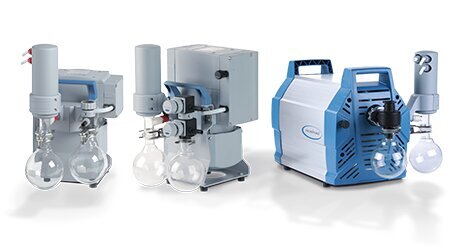 Typical applications for chemistry diaphragm pumps include evacuating chemically aggressive gases and vapors from equipment such as rotary evaporators, vacuum drying chambers, and many other laboratory applications. Chemistry diaphragm pumps from VACUUBRAND feature uncompromising chemistry designs. Their construction with fluoropolymers makes them very resistant to chemical vapors from inlet to exhaust. In this pump technology, pumping chambers are hermetically separated from the drive system. It is characterized by a high level of condensate compatibility. Two-, three- and four-stage pumps additionally have a gas ballast valve for all work with condensable vapors. Diaphragm pumps are oil-free, do not consume any water, and do not generate either wastewater or contaminated oil.